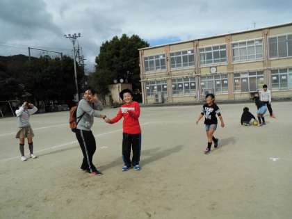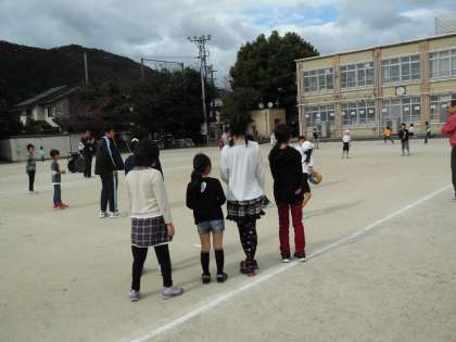 運動場ではドッジボールをしました。当たらないように逃げていました。