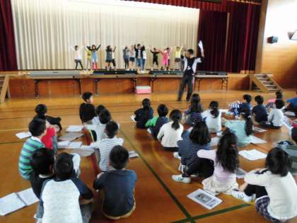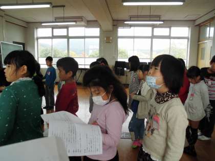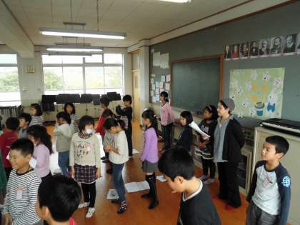 3年生の「ピノキオ」は音楽室で歌の練習をした後,体育館で動きの確かめをしました。
