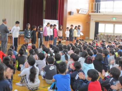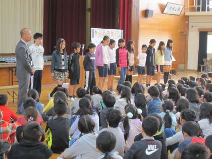 昨日行われた大文字駅伝大会支部予選に学校を代表して出場した子ども達が全校の前で紹介されました。