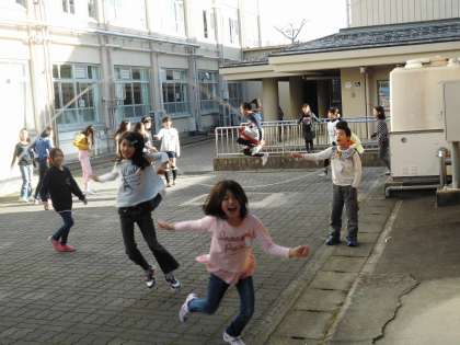 3年生が大縄で遊んでいました。あおぞらの子も縄を回して一緒に楽しんでいます。
