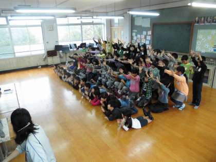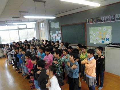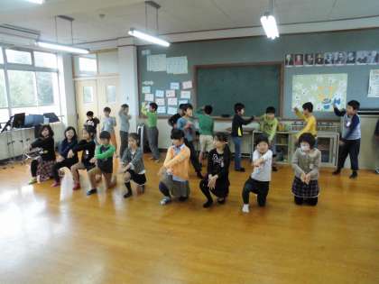 3年生の「ピノキオ」は音楽室でセリフと動きなどの確認をしてから,通し練習をしました。