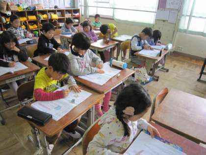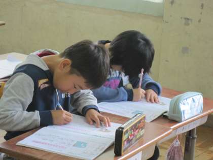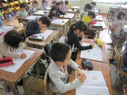 2年1組では,書き順などを確かめた後,ドリルを使って練習していました。