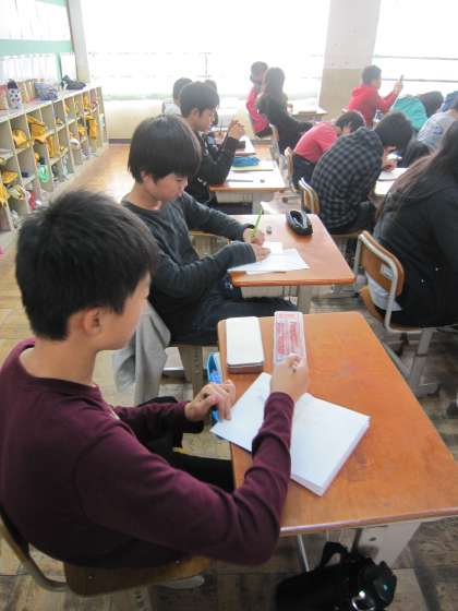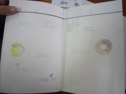 6年2組では,英語ノートにアルファベットを書き,そのアルファベットがはじめにつく言葉を書いていました。たとえば,「C」のページを見ると,「car」「cap」などと書いていました。