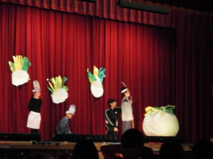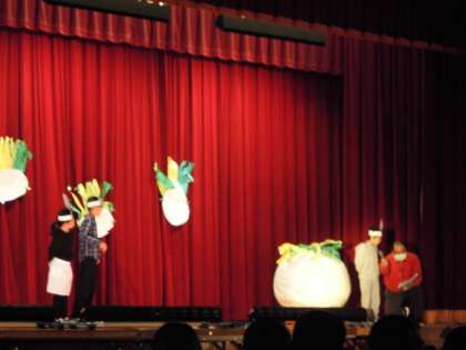 あおぞら学級の劇「おおきなかぶ」 みんなで力をあわせて「よいしょ よいしょ」おおきなかぶが地面から抜けるところがよかったです。