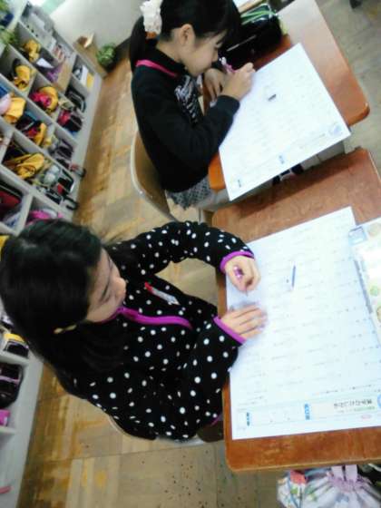 「(千円)札」の「札」という字を書いたり「名札をはる」の「名札」という漢字の読みを書いたりしていました。