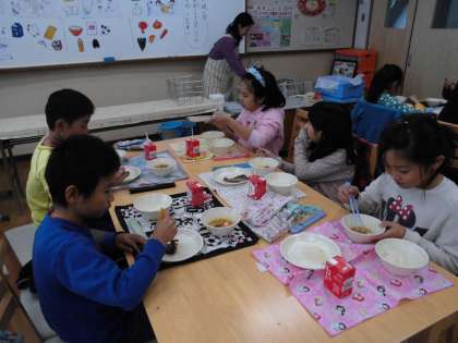 3年1組では,栄養についての学習の後,ランチルームで給食を食べました。