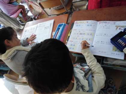 ひきざんがすらすらできるようになるために,ドリルを使って練習問題に取り組んでいます。