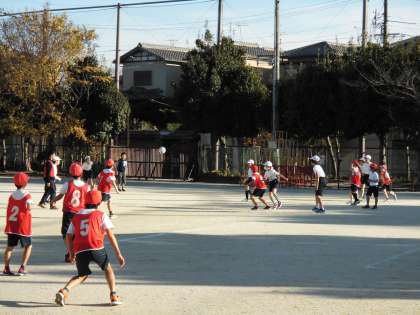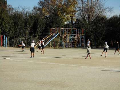 運動場では,ティーボールとサッカー・キックベースの二つのクラブ活動が行われていました。冷たい風の中でも元気いっぱいの活動していました。