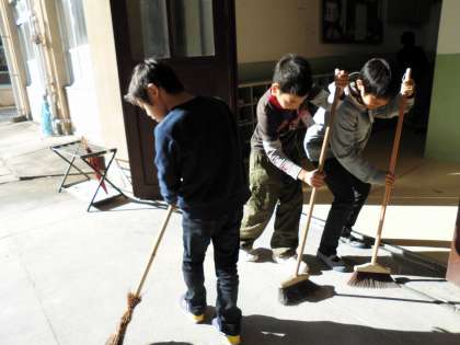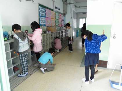 交流掃除で初めて,靴箱の掃除をしました。小さなほうきを使って砂を掃き出します。校舎の出入口は大きなほうきで掃きました。