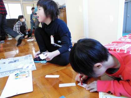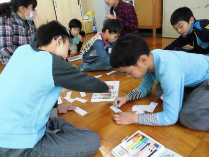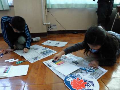 小さな巨匠展に向けて,松尾小学校のみんなと作品作りをしました。「まつり」をイメージしてうちわ屋さんをします。