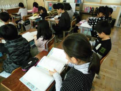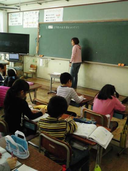 2年1組では,教科書に書かれたいろいろな形から三角形と四角形を分けていきました。