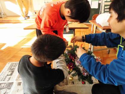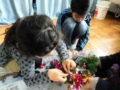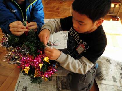三校交流のクリスマス会を18日にします。プレゼント交換のためにリースを作りました。