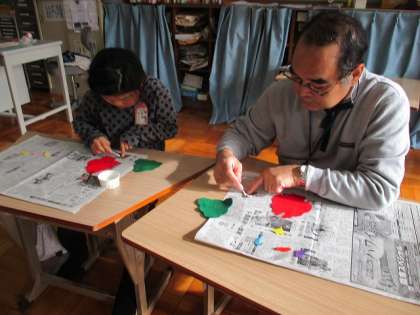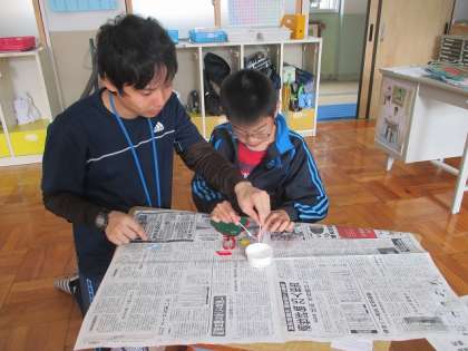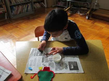 来週のクリスマス会に向けて,クリスマスツリー作りをしました。めん棒を使って飾り付けに接着剤を塗り,貼り付けていきました。