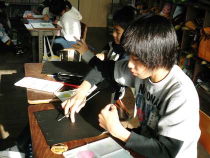 木版画で一版多色刷りをするときに気をつけることは,白を多く混ぜながら色をつけるということです。こうすると,黒い画用紙の上にきれいな色がついていくのです。子どもたちは,どんな色にしようかと考えながら色を作っていました。