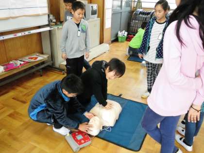 大人がするように,人工呼吸や心臓マッサージ,AEDの使用の練習をしました。