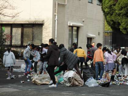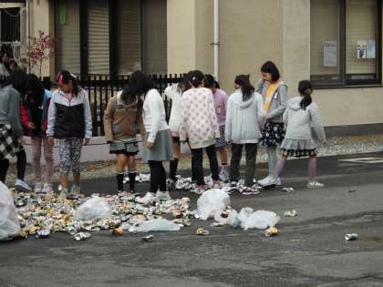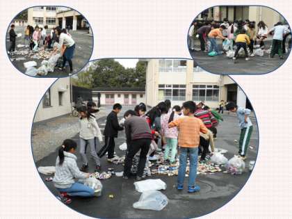 保護者や地域の方のご協力によりたくさんのアルミ缶が集まりました。そのアルミ缶を運びやすいように,子ども達が踏んで小さくしていました。