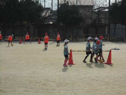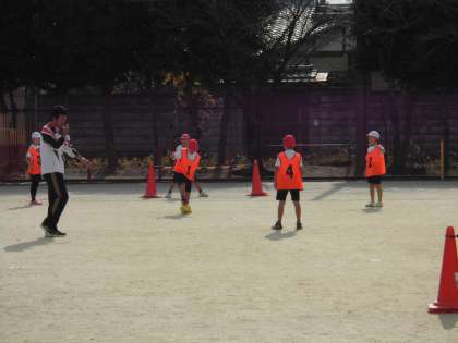 今日の2組は,学習のはじめにチームごとに練習をしていました。