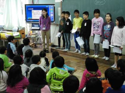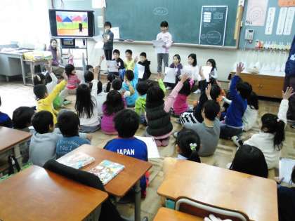 1年生は,テレビに写しだされた絵本を見ながら3年生の読み声に耳を澄ませていました。