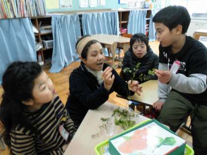 朝会で校長先生から「春の七草」についての話がありました。さっそく,校内にある七草を見つけて,ボランティアの方に草の名前を教えてもらいました。