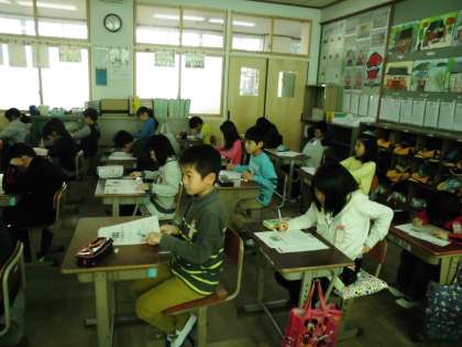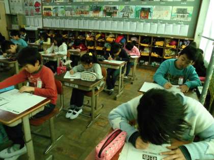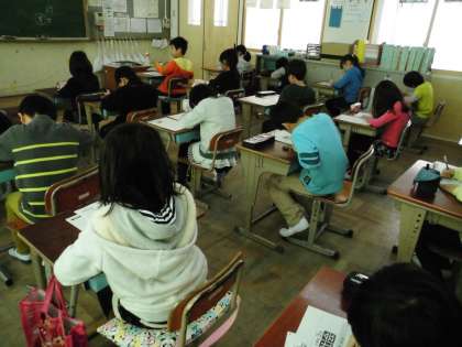 学校IDや名前ではなく自分の番号を解答用紙に記入します。3年2組では,記入の仕方を丁寧に説明していました。
