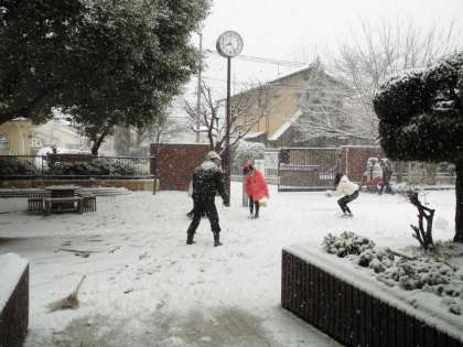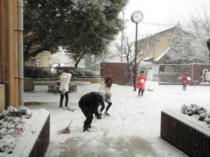 集団登校の後,雪を手に楽しむ子ども達の姿がありました。