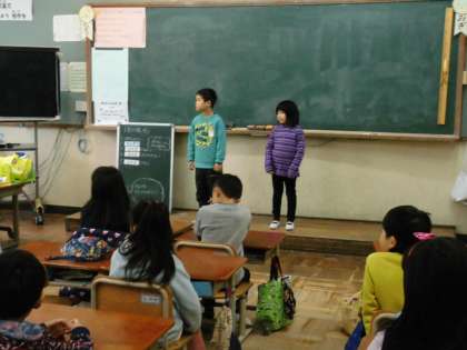 1年2組では,朝の会で日直がスピーチを言っていました。