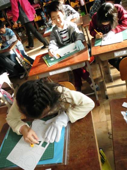 子ども達は,カッターナイフを持っていない手に手袋をはめ,画用紙に印刷された線にそって切ろうとしていました。普段カッターナイフを使うことのとても少ない子ども達です。すっと切れずに紙にひっかかって切りあとがいびつになっていました。
