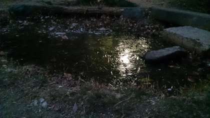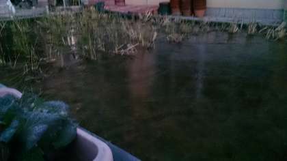 学校の中庭にあるビオトープや田にも氷が張っていました。