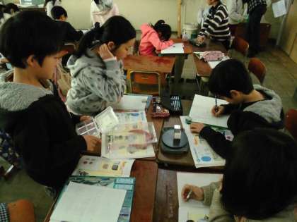 今日の1組は,「同じ体積でも,ものの種類がちがうと,重さは違うのか調べよう」と課題で,同じ体積の木・プラスチック・アルミニウム・鉄の重さを測っていました。