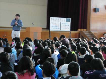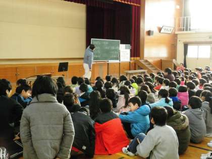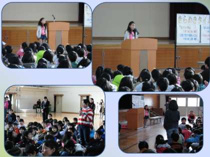 発表の前には,全校で「明日はきっといい日になる」を歌いました。