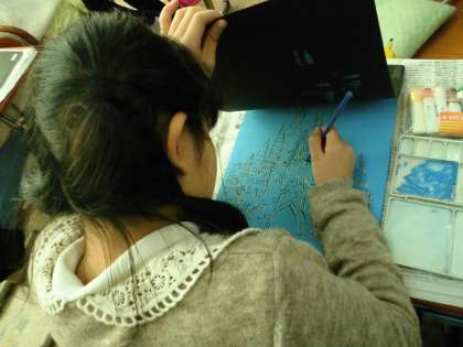 白の絵の具をたくさん使わないと色がつきにくいので,子ども達は,白の絵の具をたくさん使いながら版画を刷っていました。