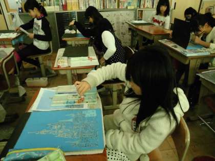 4年2組では,一版多色刷りに取り組んでいました。