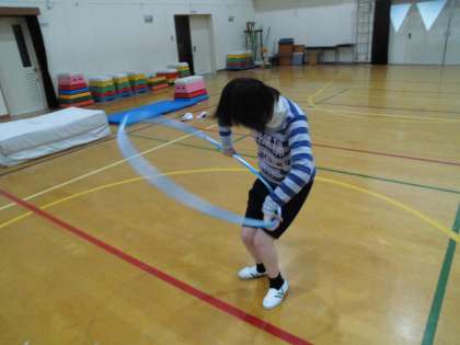 あおぞらアスレチックを作って運動をした後に,フープでケンパや回し跳びをしました。