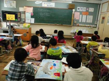 1年2組では,2月17・18日に実施する図工展に展示する絵をどれにしようかと子ども達が考えていました。