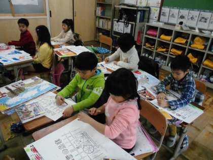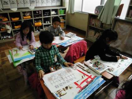 一人一人自分の描きあげた絵の中から1枚展示する絵を選びます。早く選べた子達は,「たぬきの糸車」の塗り絵をしていました。