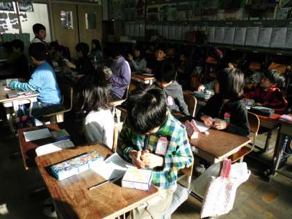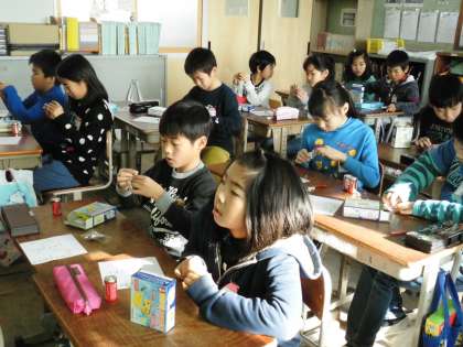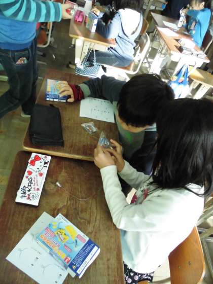 今日使う物は,ビニル導線ソケットと豆電球,かん電池です。友だちと確かめあいながら箱の中から取り出していました。