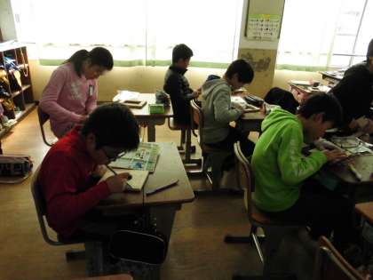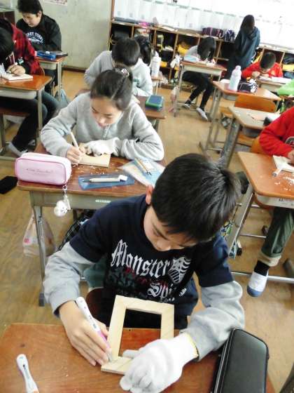 子ども達は,彫刻刀の使い方にも慣れてきたようすで,自分の下絵の通りに彫り進めていました。