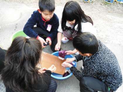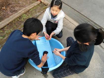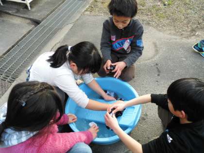 今日の1組では,洗たく板を使って靴下を洗いました。