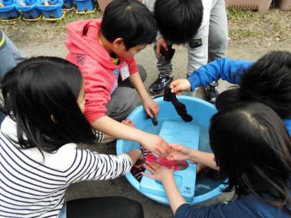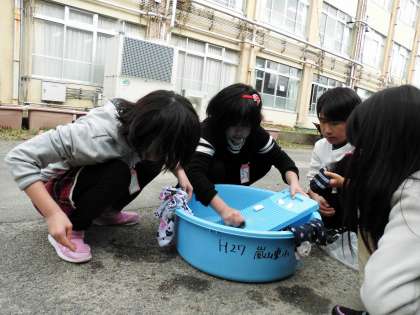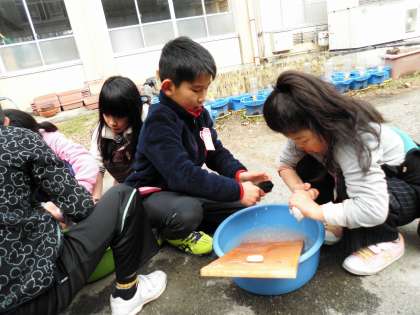 3年生の総合学習は,洗濯板を使って自分の靴下を石鹸で洗いました。「つめたい。」「こしがいたい。」など言いながら,水が汚れてくるのを見て驚いていました。