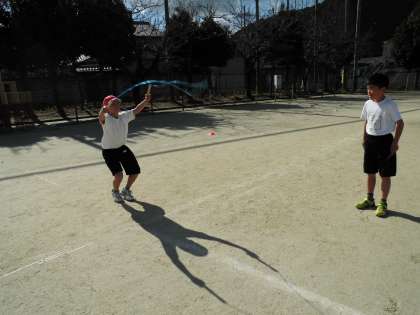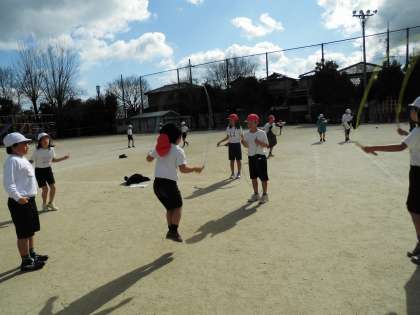 体育は,5分間走をした後になわとびをしています。個人練習の後に,二人組で数を数え合います。だんだん上手になってきています。