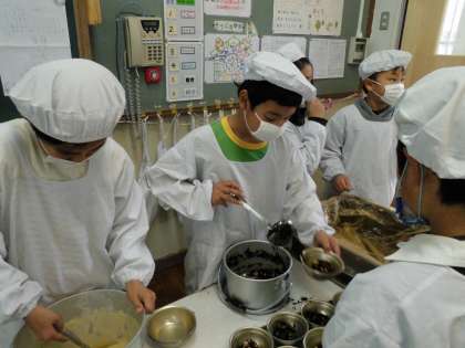 3年2組で給食当番をする子は,小さなおかずを同じ分量になるように気をつけて食器に入れていました。3年1組に行った子は,配ぜん中だったので座って静かに待っていました。