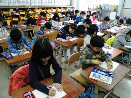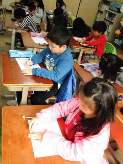 1年1組では,漢字のテストに取り組んでいました。