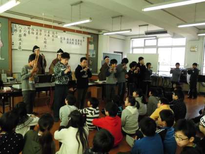 雅楽で使われる,笙,篳篥,横笛を子ども達にふかせてくださいました。