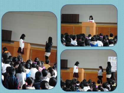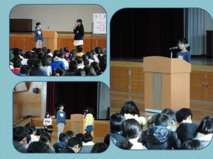 「人の気持ちを考える」「家族と声をかけあう」というテーマで,二人が発表しました。発表のあとの聞いていた子とのやり取りでは,3往復くらいのやり取りもありました。こうしたやり取りができるのは,相手の話をしっかりと聞きとっていたからです。