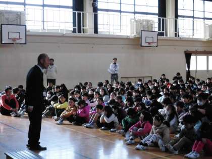 賞状を手渡した後,学校長は,持久走大会で走りきったことをほめました。そして,明日「お話コンクール」に出場する子たちを紹介しました。最後に,「粘り強く,今を大切にしていってください。」と話を締めくくりました。