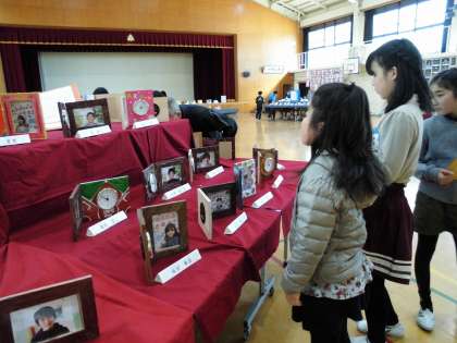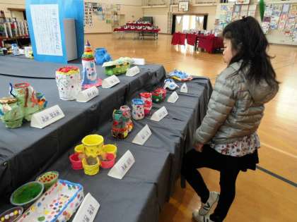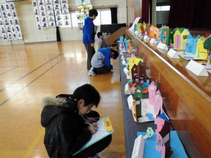 体育館で自分たちの作品を見た後,全校児童の作品を見て,良かったところをメモしていました。