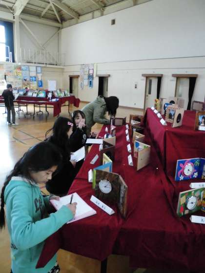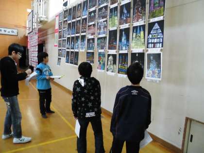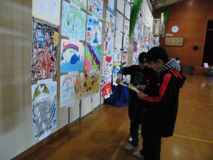 子ども達は,展示されている作品の中から気に入った作品へのコメント鑑賞ノートに書いていました。「色づかいがとにかくきれいでこの城に住みたいと思った。」(4年生の作品に)「コルクをうまく模様として取り入れていていいなと思った。」(5年生の作品へ)「キリンの模様がきれいにできていた。」(2年生の作品へ)