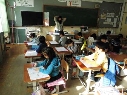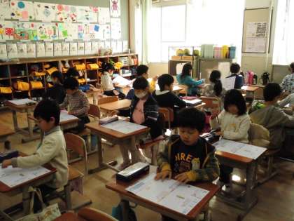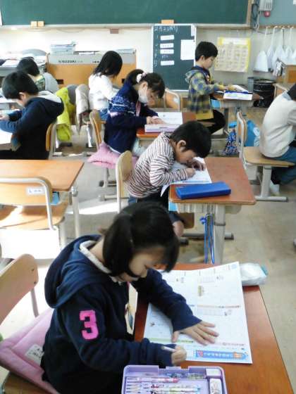 1年1組では,80字の漢字のテストに取り組んでいました。