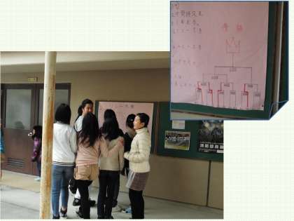 対戦が終わると,体育館西掲示板に掲示されている対戦のトーナメント表を見つめる子ども達がいました。