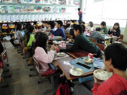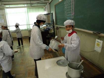 今日の給食交流では,給食当番もして,クラスの友達と給食を食べました。